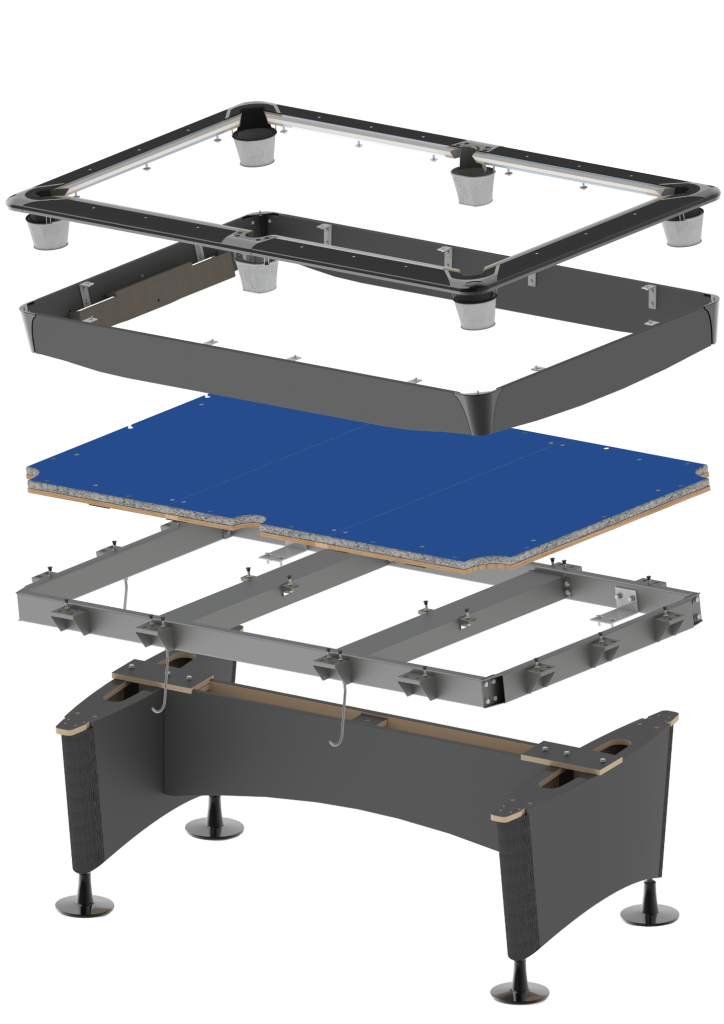 We have taken the billiard table to the next level with our revolutionary new Unibody frame design. This innovative design features a solid and rigid steel frame that has been engineered to provide the ultimate in stability and strength. The Unibody design offers several advantages over traditional frame designs, including quicker and easier installation, reduced noise during play, and more precise table level adjustment options. With 24 levelers, players can ensure that the slate is perfectly level and the balls roll smoothly and accurately. The Unibody design is not only stronger and more rigid, but it also provides a sleek and modern look that adds to the overall aesthetic of the billiard table. This new design is a testament to our commitment to providing the best possible playing experience for billiard enthusiasts. The Unibody frame is an investment in quality and performance that will last for years to come.