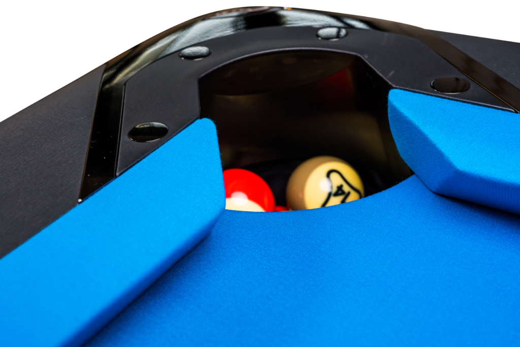 The Clash Steel Pro Alumen uses high quality Clash Pro Pockets with specially designed PVC pocket liners which meets the highest match standards to ensure maximum comfort and playability. The slanted form of the pocket liner ensures that a potted ball always ends up inside the pocket instead of bouncing back out. We have optimized the pocket design and geometry to get accurate and correct potting results, even in the middle pockets. The mounting system avoids the use of fixing components in the pocket liner that could damage poolballs. Each pocket can contain a complete set of balls.